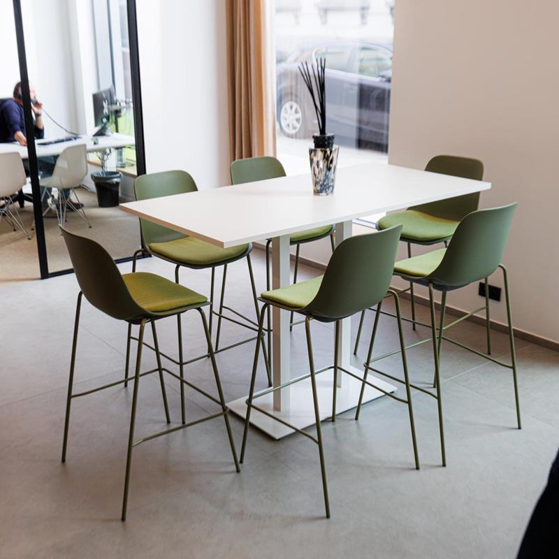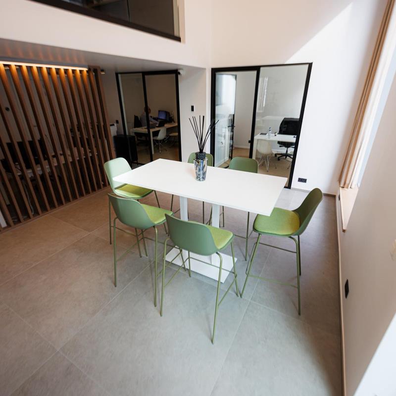 Der Ausbau umfasst 200 m² und beinhaltet sieben Arbeitsplätze, Bereiche für Empfang und Wartezone, eine Pausenecke sowie eine Mezzanine. Die Flächen wurden so strukturiert, dass Wegeführung und Funktionen eindeutig sind. und dass individuelle Arbeitsbereiche entstehen, ohne Licht und Offenheit zu verlieren.
