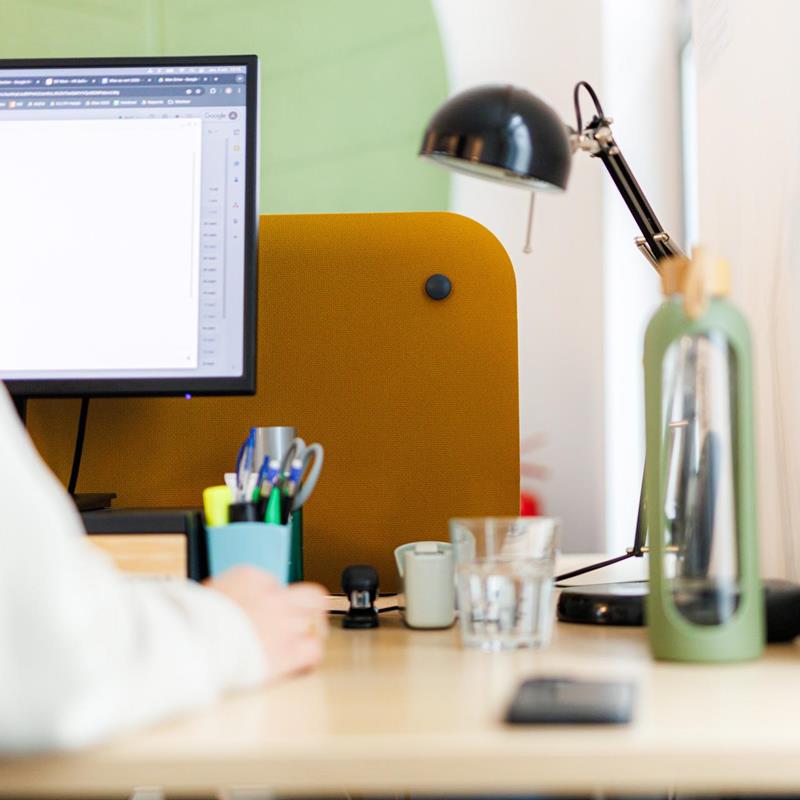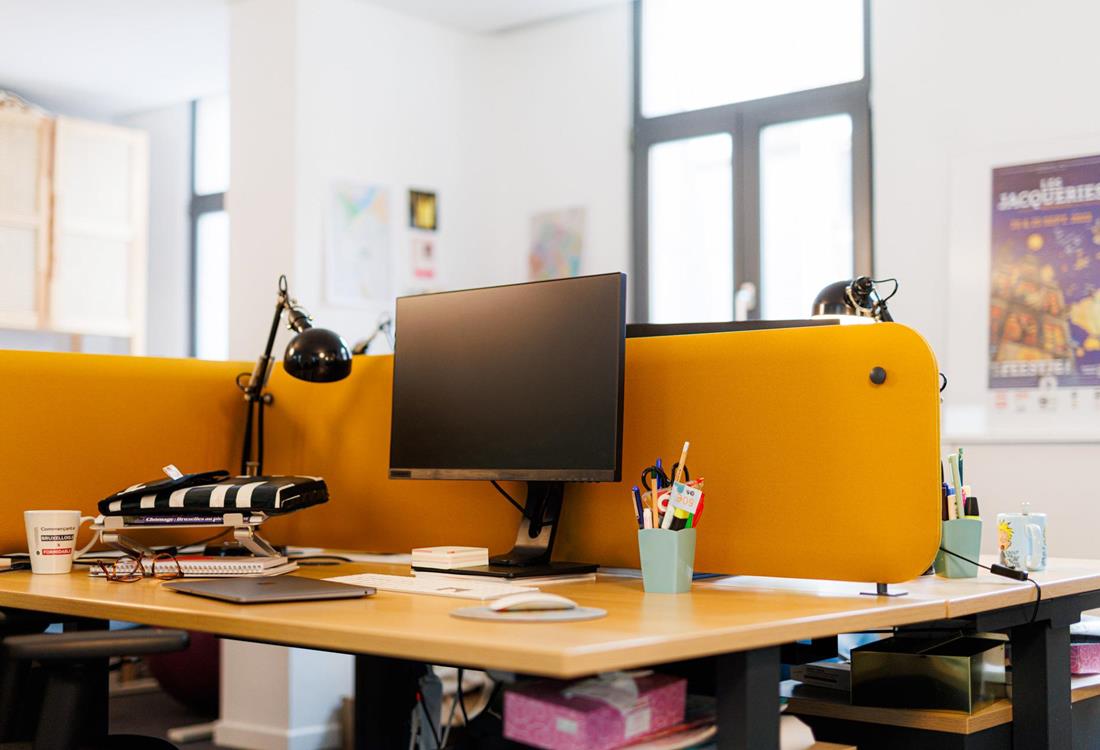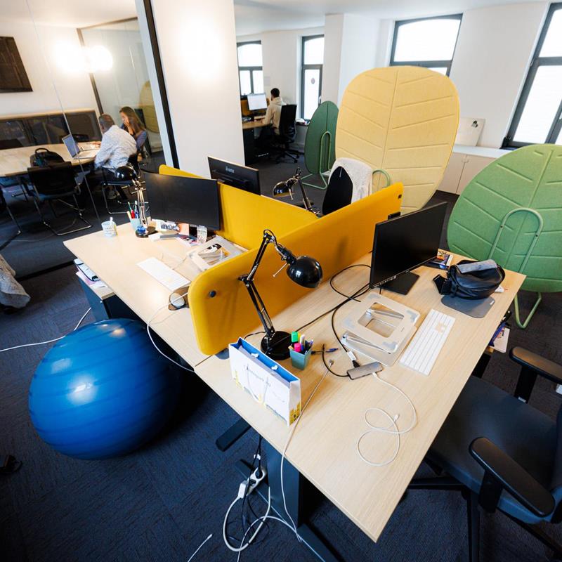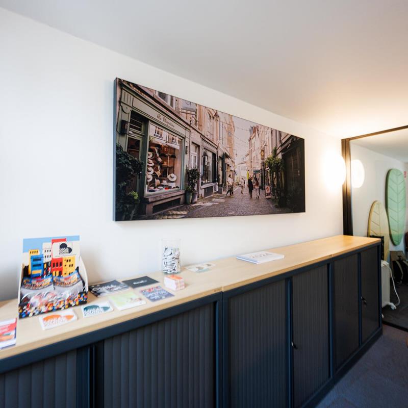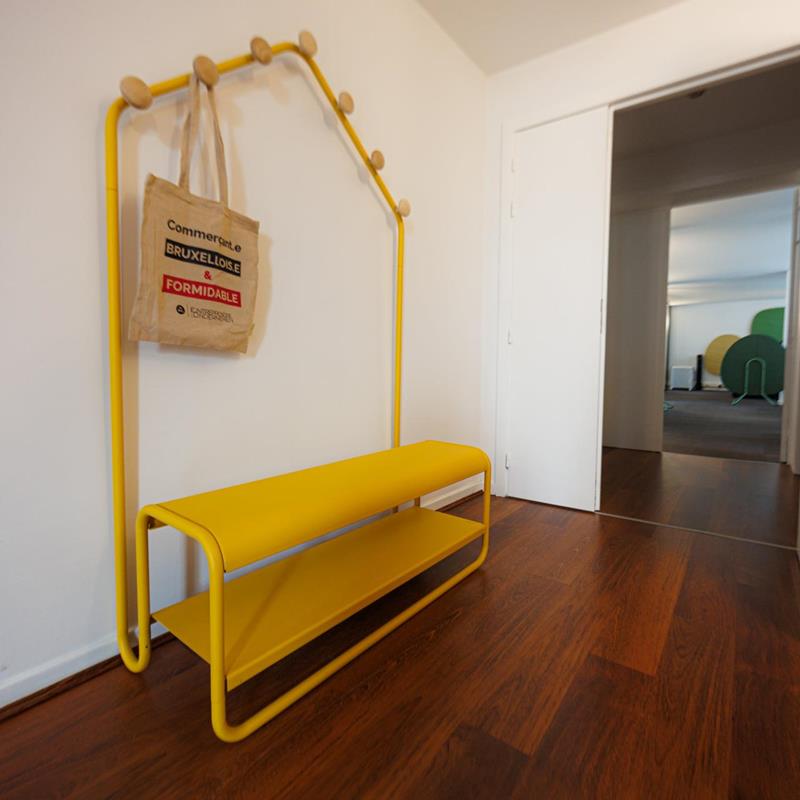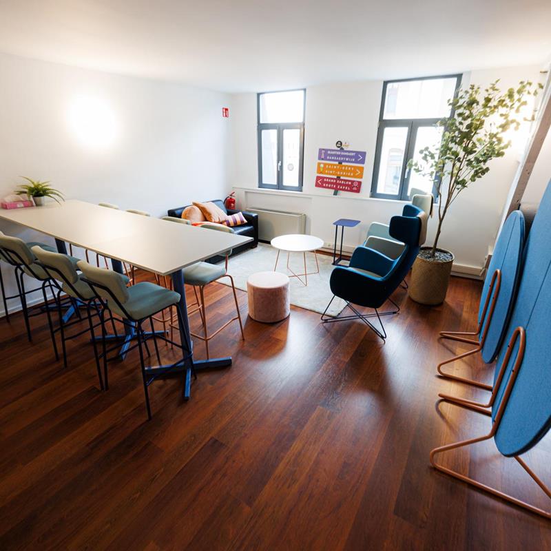 Côté aménagement et confort, les solutions acoustiques murales ont été réalisées avec INCATRO, notamment via des panneaux acoustiques muraux avec impressions sur toile. Le mobilier principal et les éléments complémentaires relèvent de BEJOT. Enfin, un porte-manteau de marque FERMOB (modèle « maisonnette ») a été intégré en tant qu'élément ponctuel.